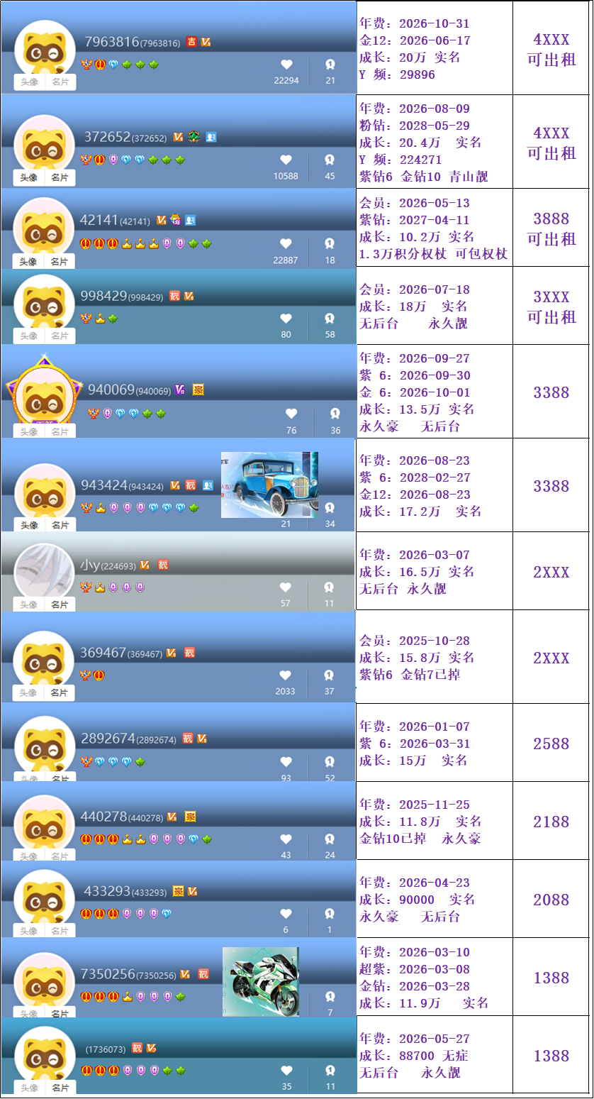 616361—–1140级–8304元—有证实名权杖—年费V8–年费期限2026.01.10–成长值158000+–永久靓.–金钻12到期2026.02.01–紫钻6级2024.03.16